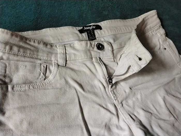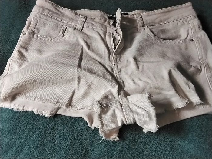 Short en jean de couleur crème. Braguette et bouton. Poches devant et derrière. Petites franges en bas. Jennifer. Taille 38. Peu porté. #julievertrezfemme #julievertrezm