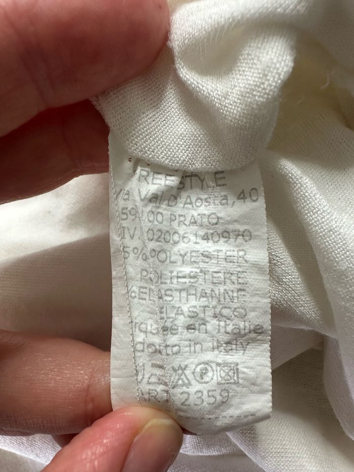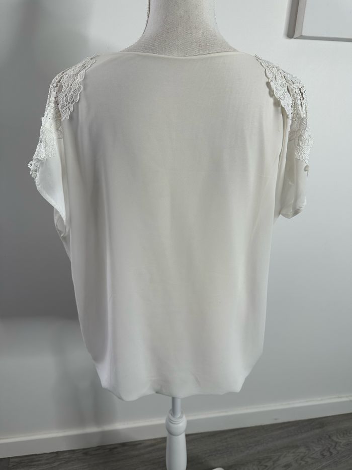 Blouse - Excellent état - Taille 40 équivalent L - Couleur blanche - Manches courtes - Col rond - Broderies au niveau des épaules - Polyester et élastane - Fabrication italienne 🇮🇹 Dimensions: - 60cm niveau aisselles - 60cm de long