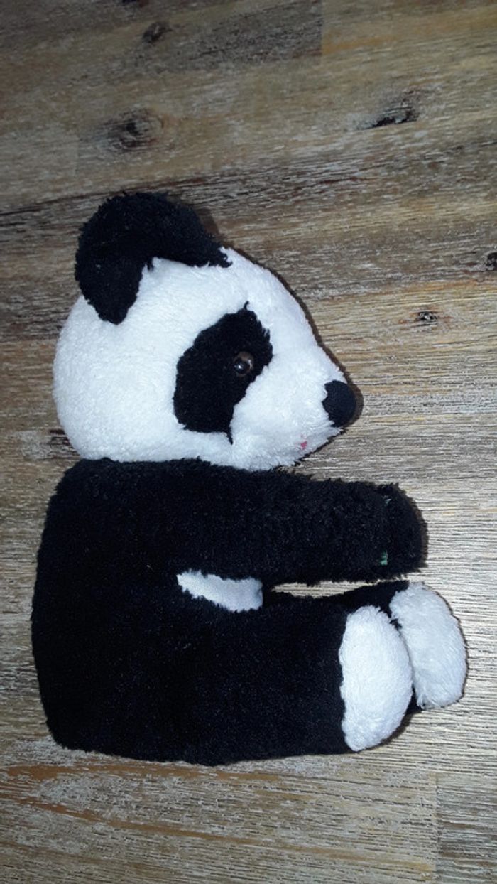 Peluche en forme de panda, ses pattes avant se scratchent. Mesure environ 20cm de haut. #julievertrezjouet