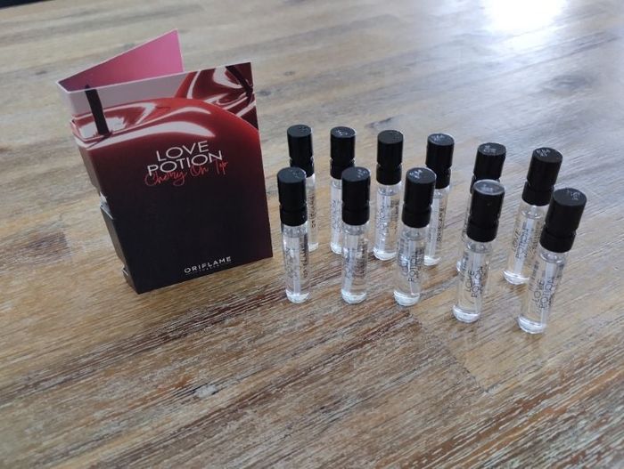 Eau de parfum pour femme Love Potion Cherry On Top d'Oriflame. Format voyage. Lot composé de 12 flacons de 2ml (soit 24ml au total). Neuf.