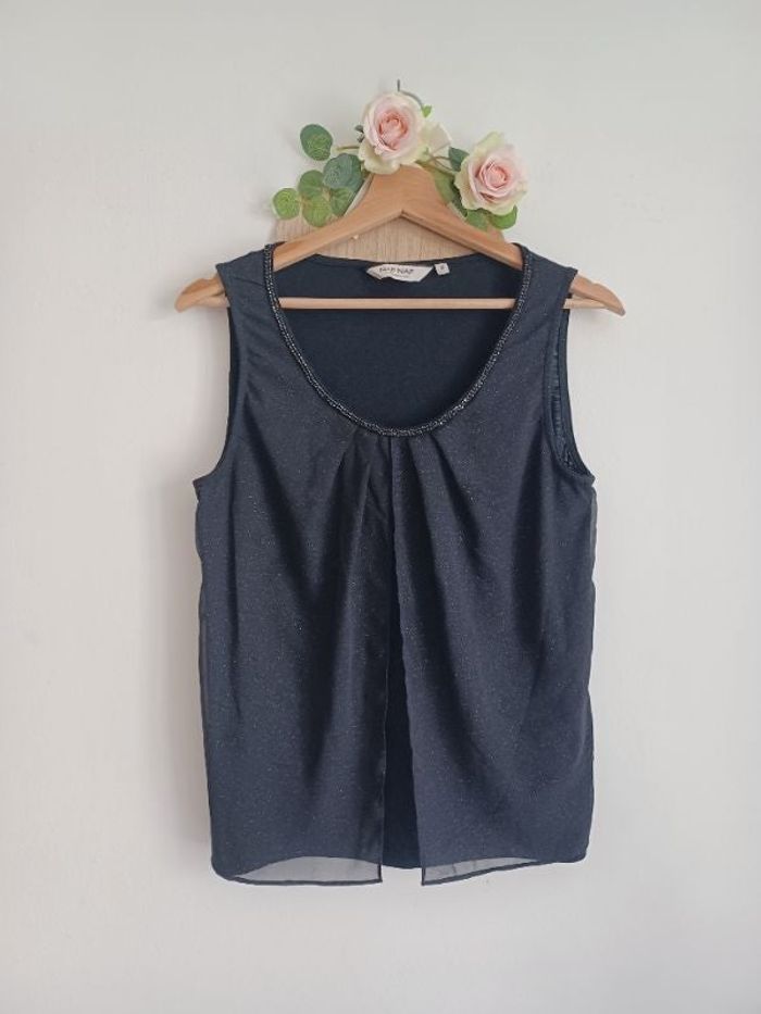 🌺Je vous invite à consulter mon profil avant achat🌺 Top noir pailleté en très bon état. Doublé effet voile à l'avant. Encolure avec sequins Etiquette coupée, mélange coton /polyester Dimensions à plat : largeur 46cm (aisselle à aisselle), longueur 56cm Indiqué taille M= 38 (cf dimensions). Le mannequin est de taille 38/40 #top #noir #paillette #sequin #perle #sansmanches #habillé #soirée #nafnaf #38 #M