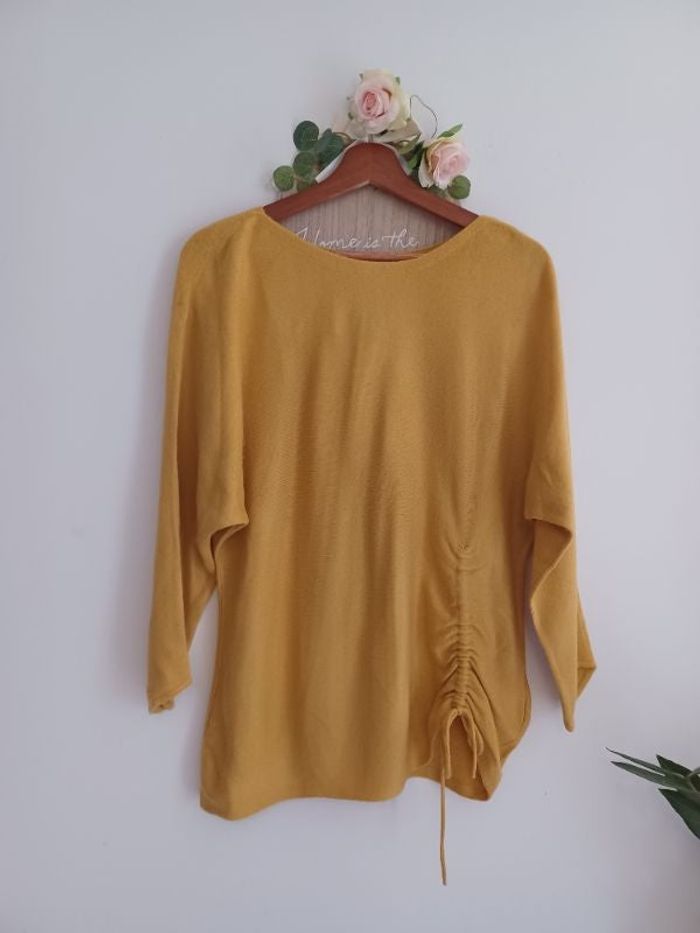 🌺Je vous invite à consulter mon profil avant tout achat🌺 Pull moutarde tout doux en très bon état. Lien de resserage sur le côté à nouer. Acrylique. Idéal mi-saison Dimensions à plat : largeur 52cm (aisselle à aisselle), longueur 65cm Indiqué taille M. La marque taille grand. Ok pour 38 ample ou 40 plus ajusté (cf dimensions). Le mannequin est de taille 38/40 #pull #moutarde #doux #misaison #colrond #graindemalice #M #milong