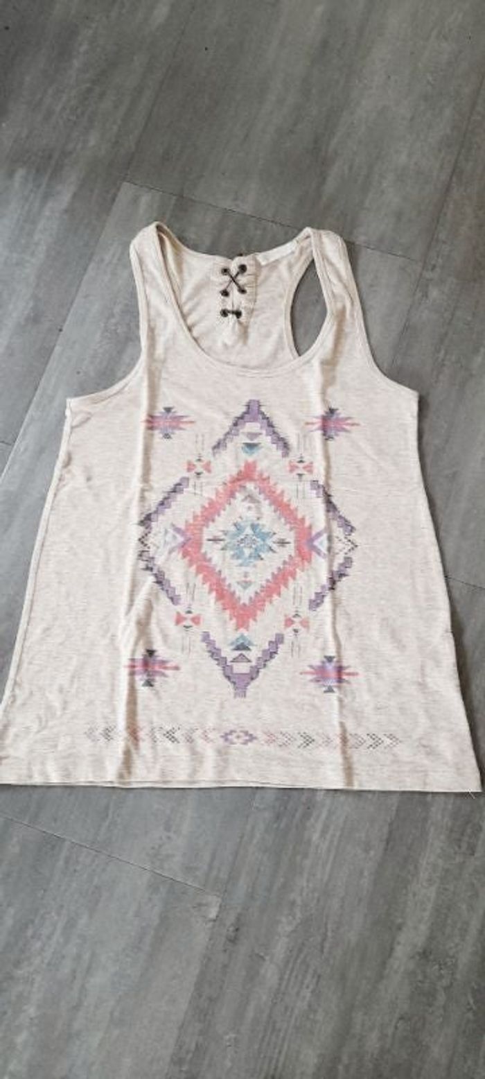 En matière fluide et douce, beige chiné. En très bon état mais le lacet en cuir est usé