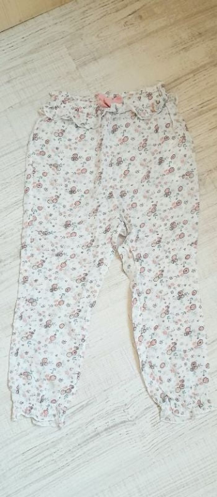 Peu porté, comme neuf. Matière douce et légère 100% viscose, resserré à la taille et aux chevilles. Blanc imprimé petites fleurs roses