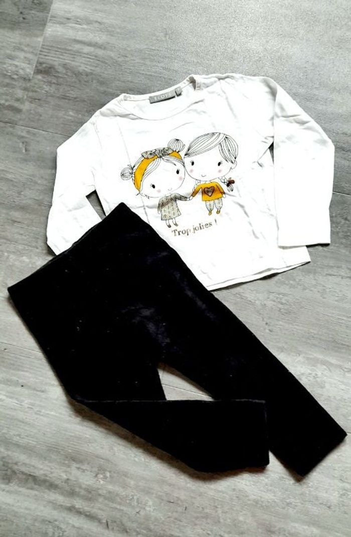 Tee-shirt manches longues en coton blanc. Pantalon legging en velour côtelé noir, taille elastiquée.