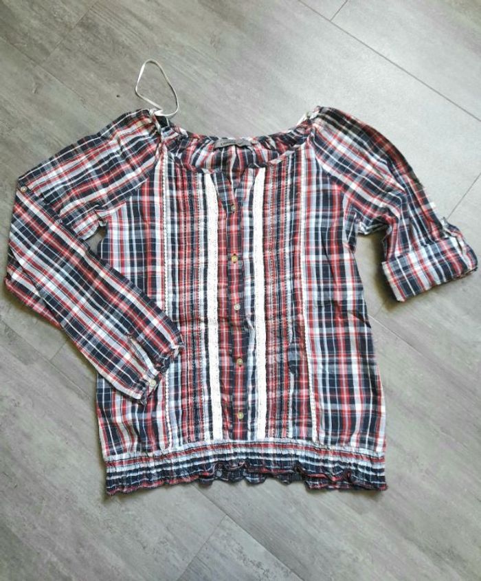 Neuve jamais portée. 100% coton marine rouge et blanche. Boutonnée mais s'enfile, base elastiquée et smockée. Manches retroussable. Boutons nacrés