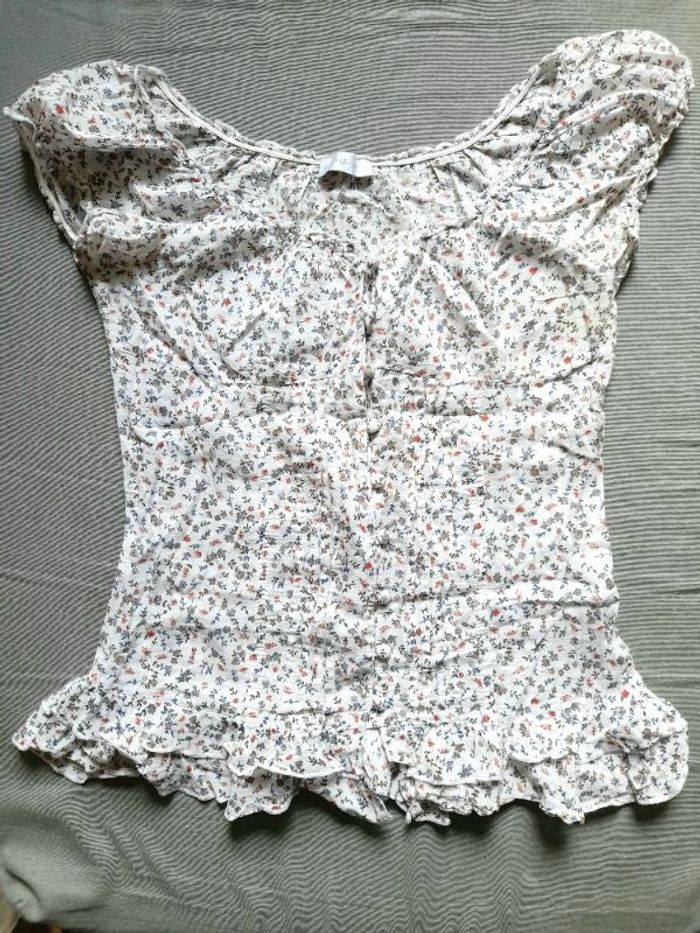 Blanc imprimé petites fleurs 100% coton. Col rond, épaules légèrement bouffantes. Boutons ton sur ton de haut en bas