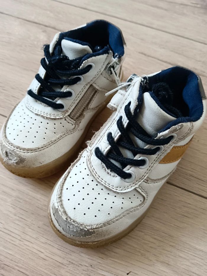 Basket blanche avec rayure jaune moutarde, abîmé sur le devant. Taille 20 Lacet bleu marine et fermeture sur le côté. Inscription New York dessous. Réduction sur les lots