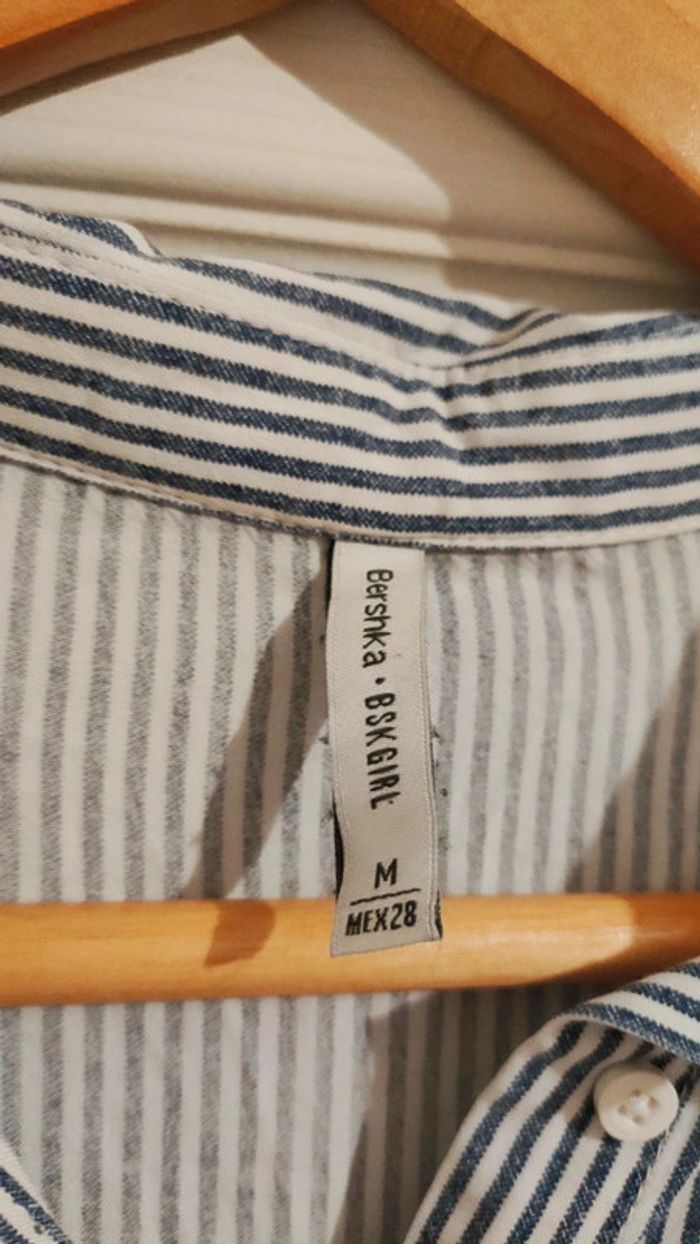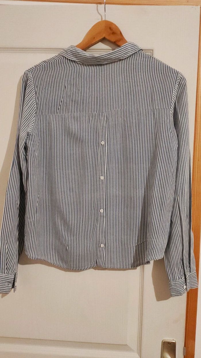 Chemise rayée bleu et blanche en très bon état, boutons décoratifs dans le dos. Une poche devant. Réduction sur les lots