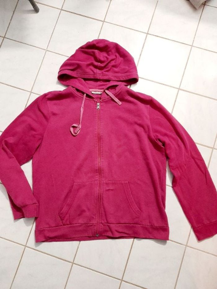 En molleton rose fushia. Petit trou en bas du sweat (voir photo 4) mais le reste en bon état
