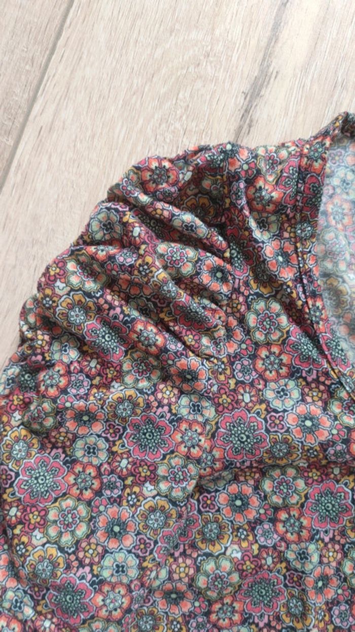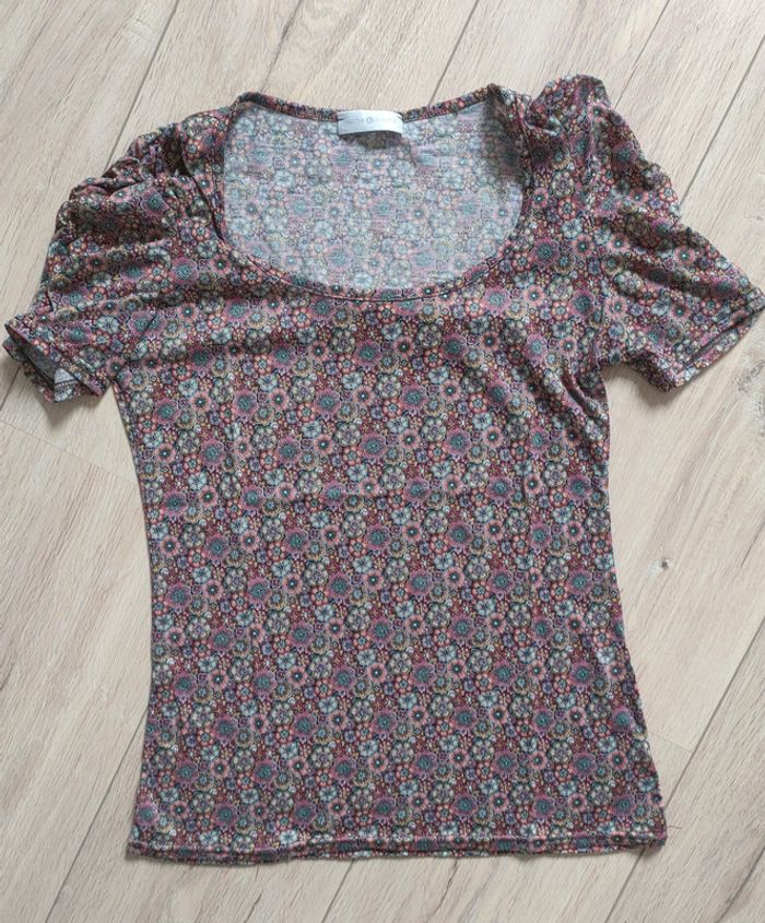 Tee-shirt fleuris cache cache, assez fin, épaules bouffantes.