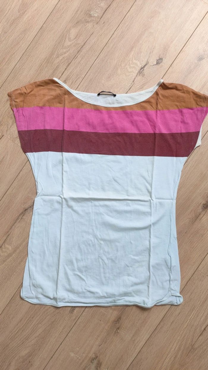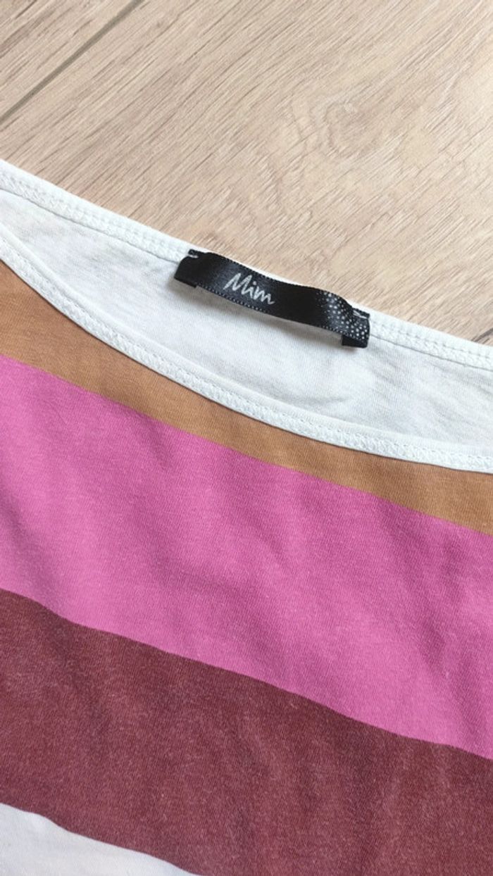 Tee-shirt mim avec rayures rose et Camel, le blanc à un peu jauni. Tee shirt large et long