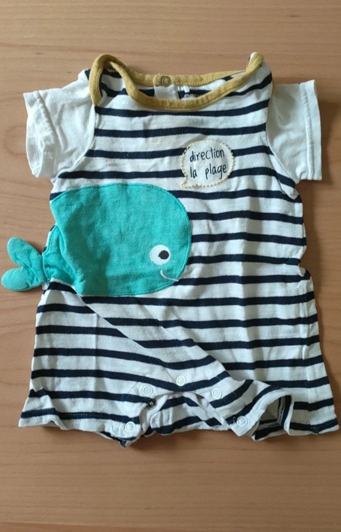 Combinaison/ grenouillère de plage en très bon état. Style marin avec motif balaine. Réduction sur les lots