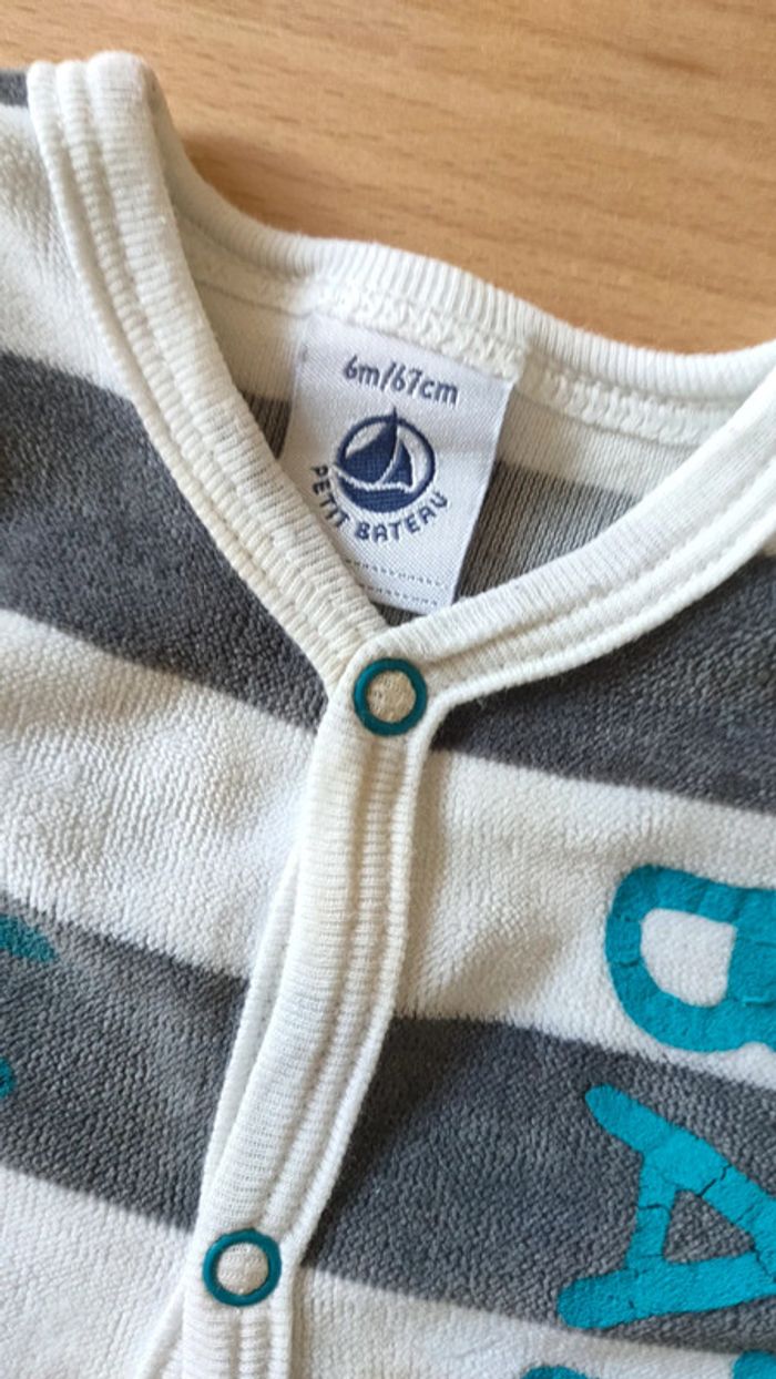 Pyjama marinière rayé gris et blanc avec un très beau bleu canard sous les pieds. Couleurs très sympa mais présente une tâche un peu jaune au niveau du col (photo 2). 6 mois/67cm. Réduction sur les lots