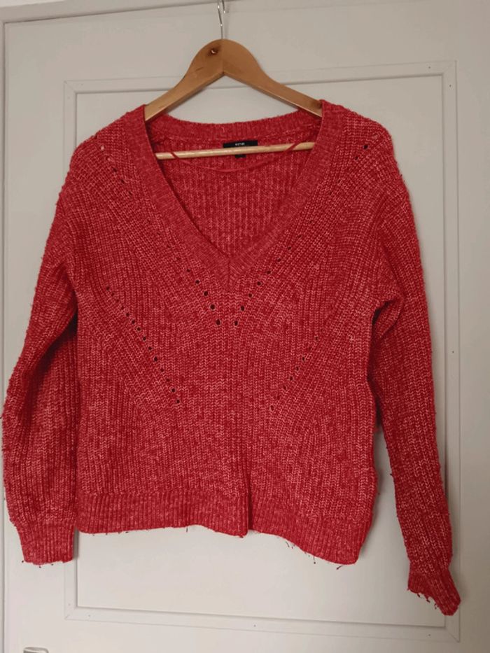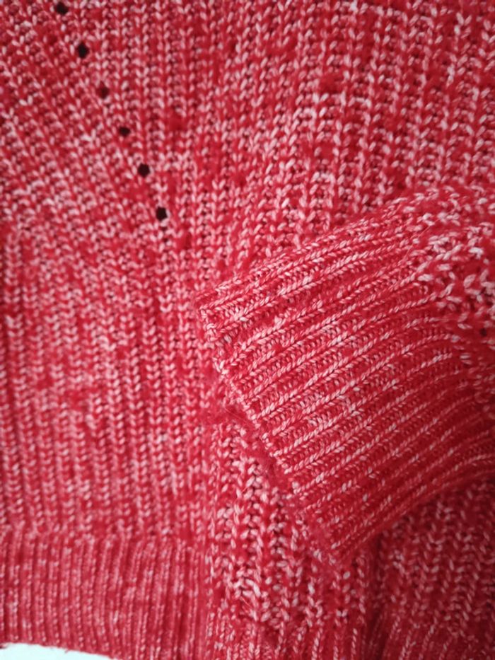 Pull en laine rouge et blanc, présente des bouloches. Réduction sur les lots
