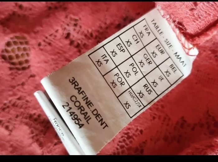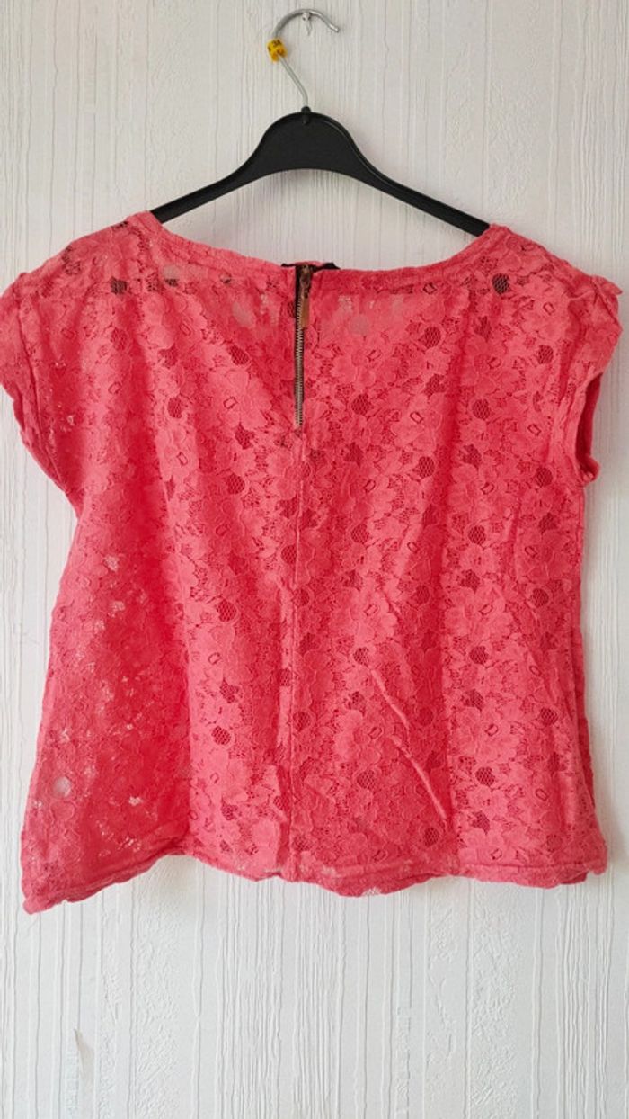 Tee-shirt/blouse en dentelle (transparent) taille XS mais convient également à un S car assez large. Manches courtes et fermeture dans le dos.