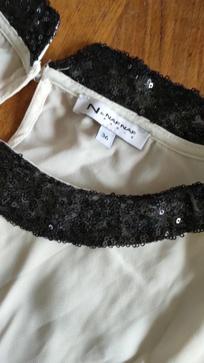 Blouse sans manche, col claudine, couleur écru avec col pailletté noir. Bouton pour fermé dans le cou.