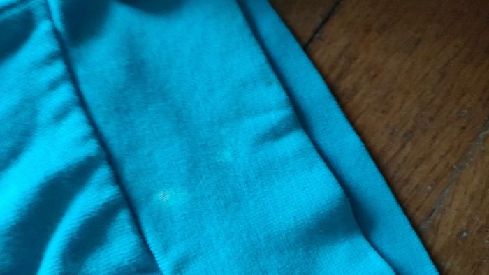 Veste sweat à capuche et poches, bleu turquoise. Petites tâches en bas (voir photo).