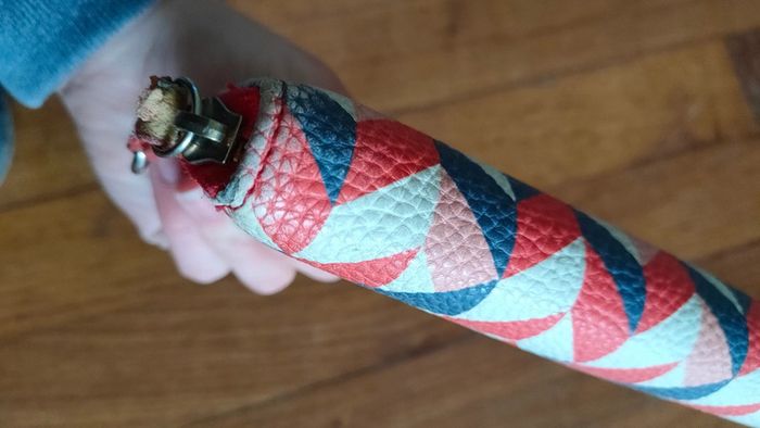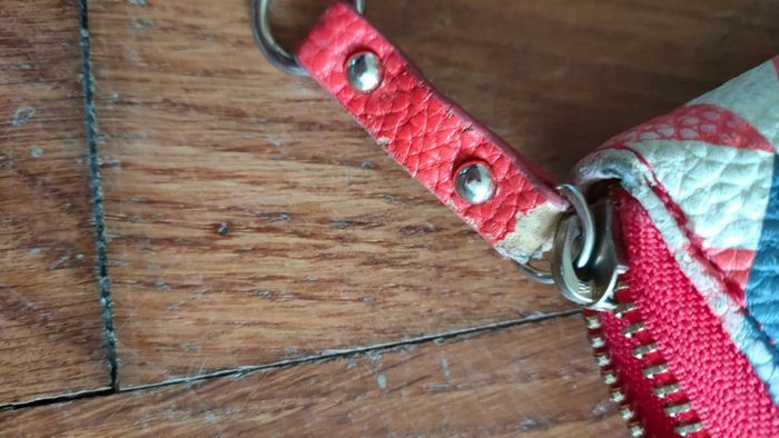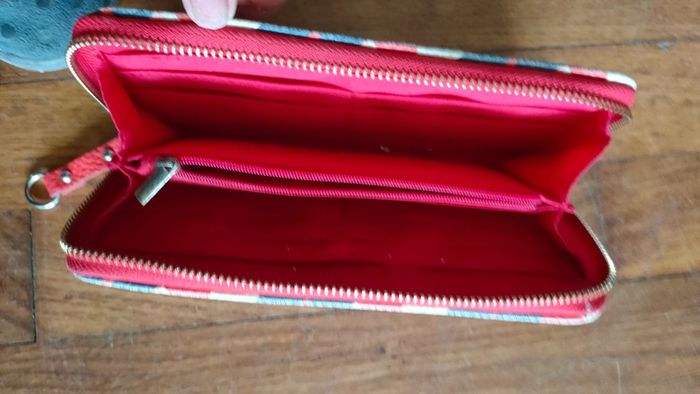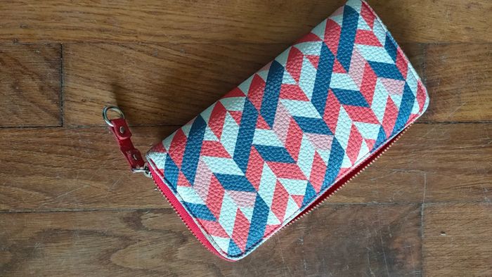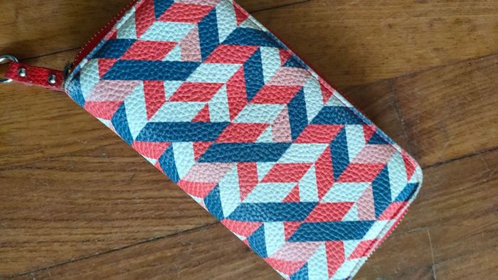 Portefeuille motif géométriques bleu rouge blanc et rose, la boucle de la fermeture est abîmé (voir photo) et la couleur en dessous est légèrement passé (voir photo).