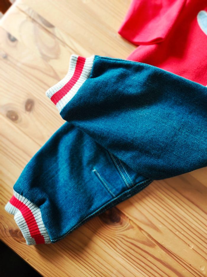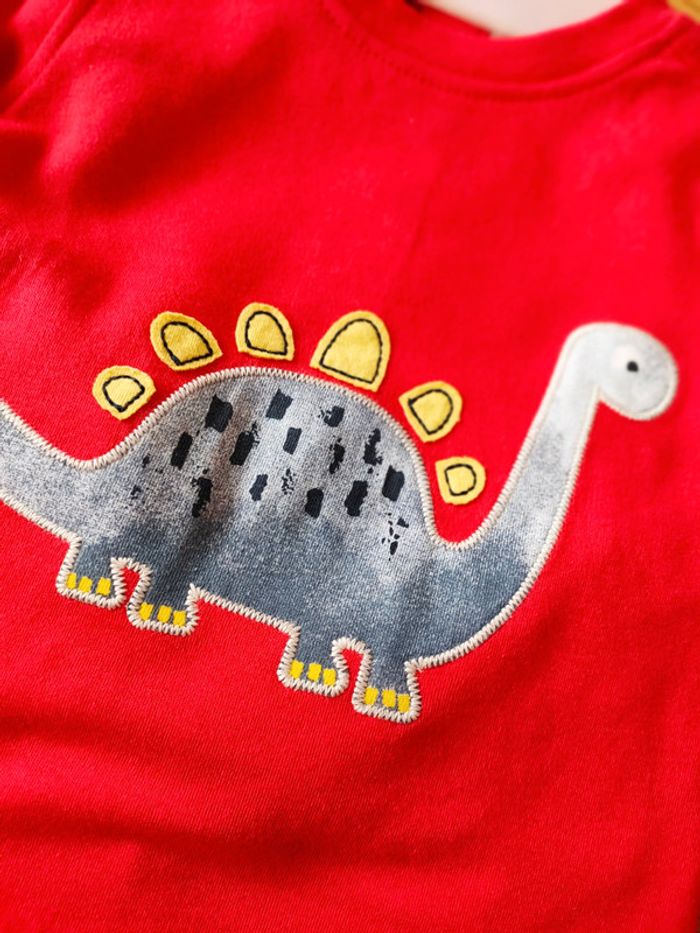 Tenue tee-shirt à manches longues rouge avec dinosaure + pantalon en jeans avec élastique au pied. Neuf jamais porté.