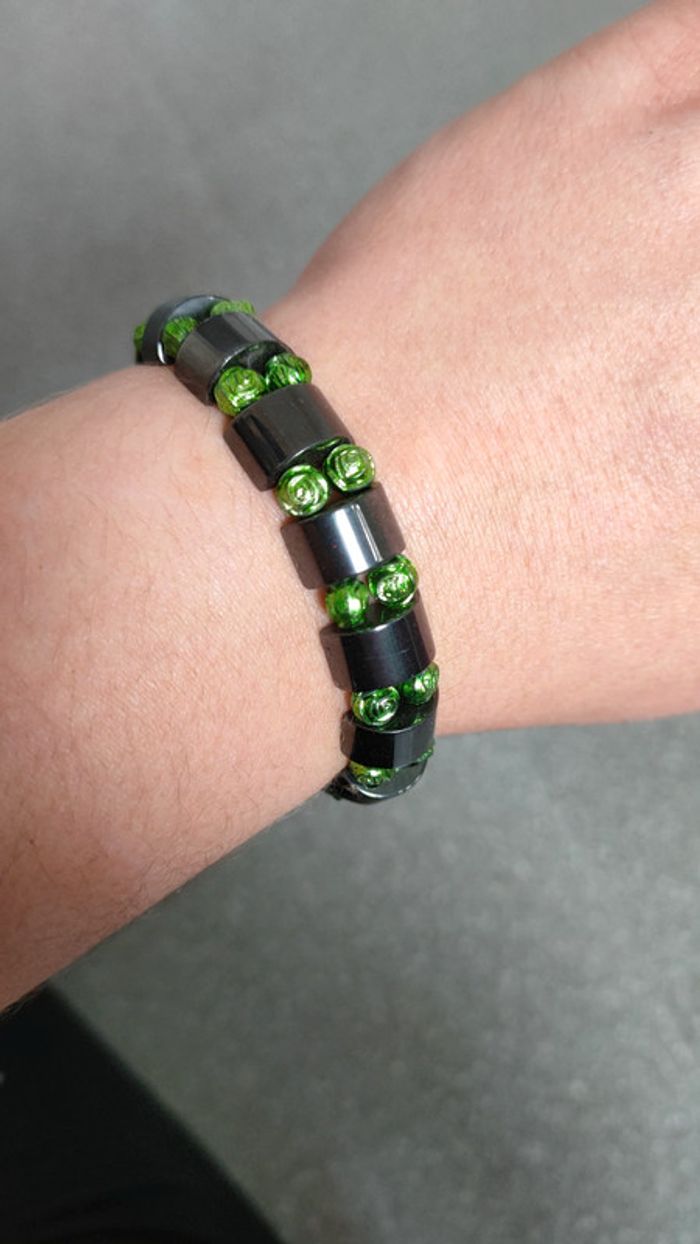 Bracelet alimenté noir avec des perles en forme de roses vertes. Il est élastique.