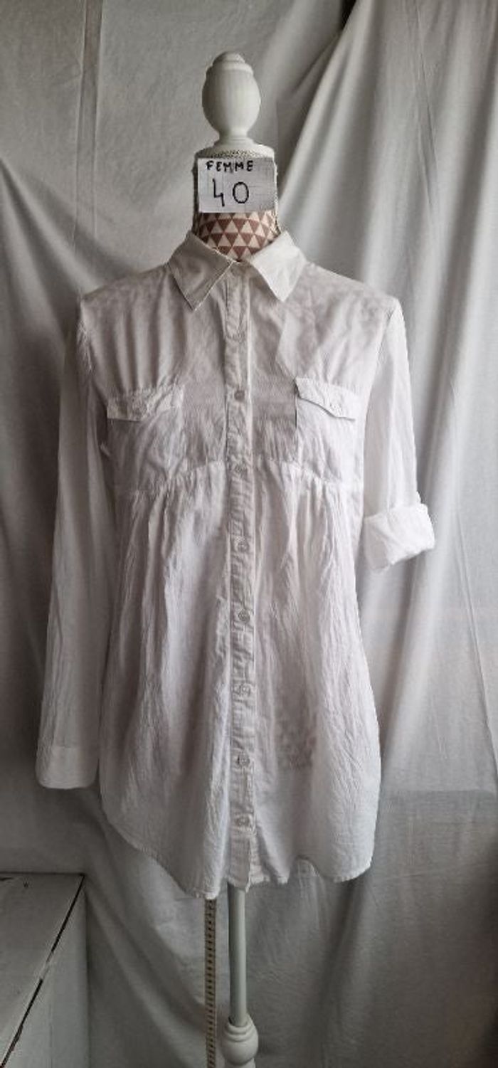 Chemisier, blanc, en coton, en très très bon état, longueur 72cm, largeur d'épaule 38cm, largeur sous bras 48cm, marque Kiabi =5€