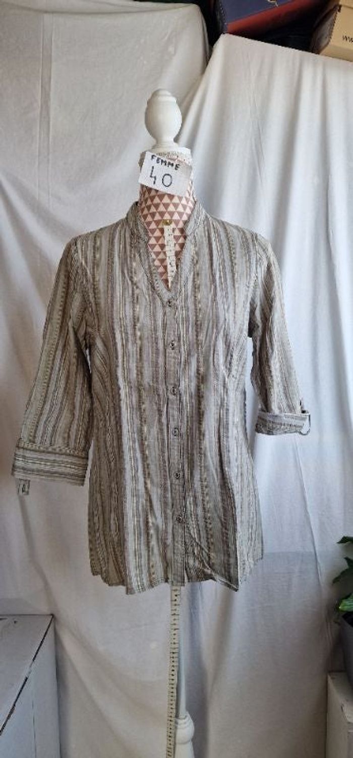 Chemisier, vert, a fines rayures marron,en très très bon état, en coton, manches relevable, longueur 66cm, largeur d'épaule 37cm, largeur sous bras 50cm, marque Kiabi= 4€