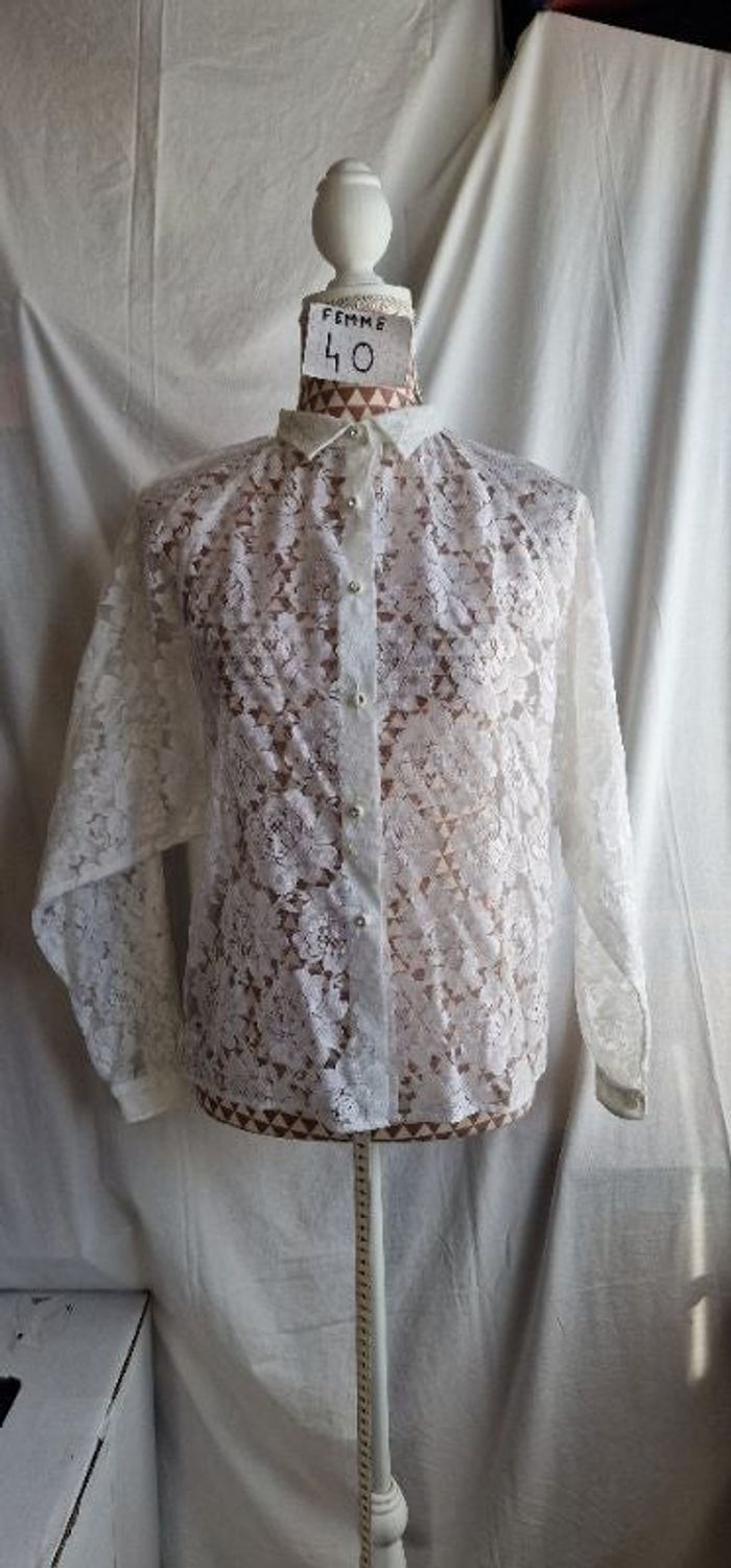 Chemisier, transparent, blanc, a fleurs,avec boutons brillant, en très très bon état, en viscose/acétate/polyamide, longueur 56cm, largeur d'épaule 40cm, largeur sous bras 49cm, marque Benetton =8€