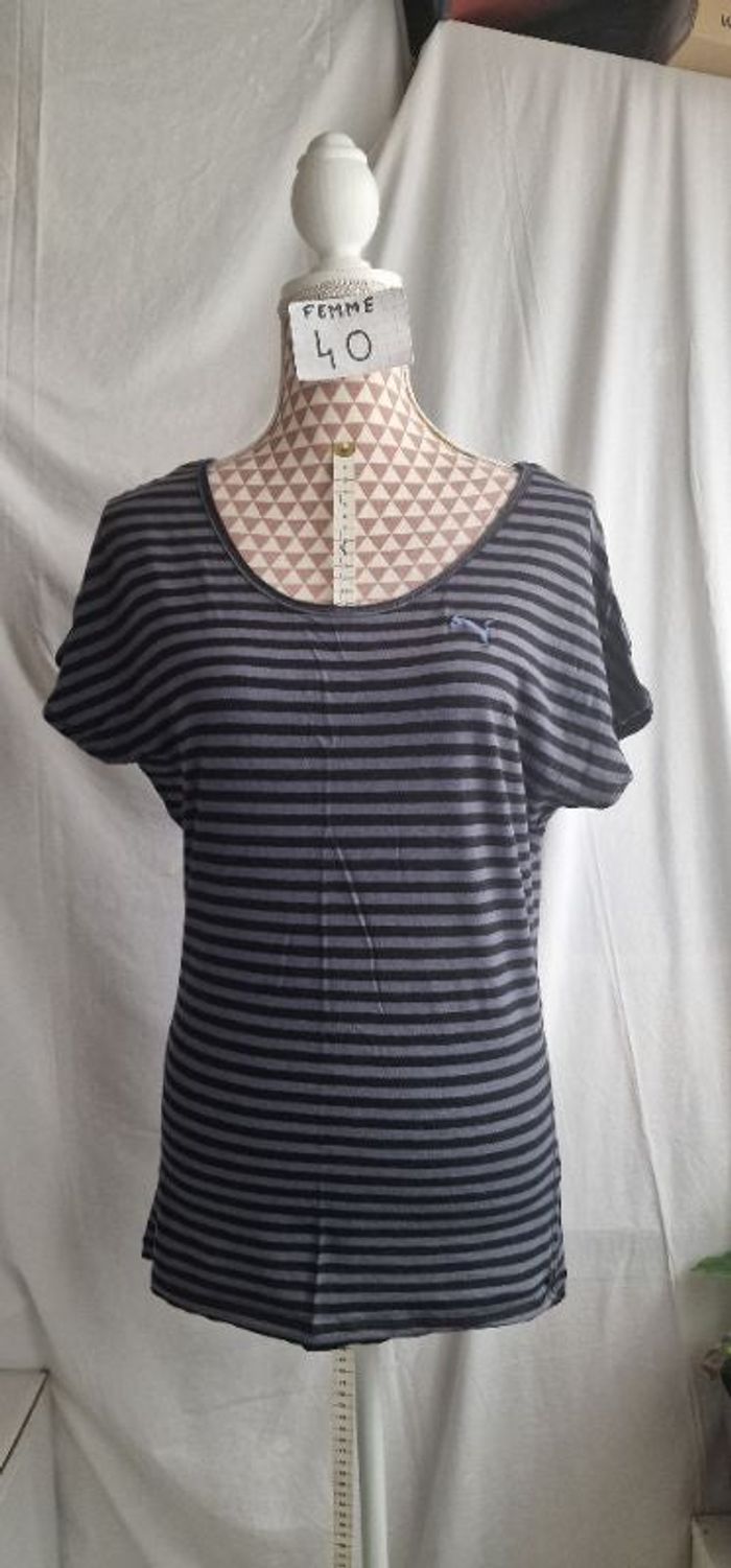 Tee-shirt, noir à rayures grises, en très très bon état, en coton &elasthanne, longueur 68cm, largeur d'épaule 42cm, largeur sous bras 51cm, marque Puma =9€