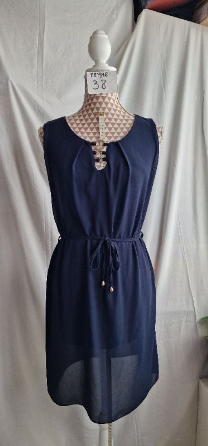 Robe, marine, avec anneaux décoratif argentés sur le col,en très très bon état, en viscose &elasthanne, avec ceinture, longueur 91cm, largeur d'épaule 35cm, largeur sous bras 48cm, marque Bleu Bonheur =6€