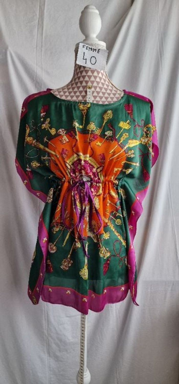 Blouse, multicolore, satiné, en très très bon état, en viscose, longueur 69cm