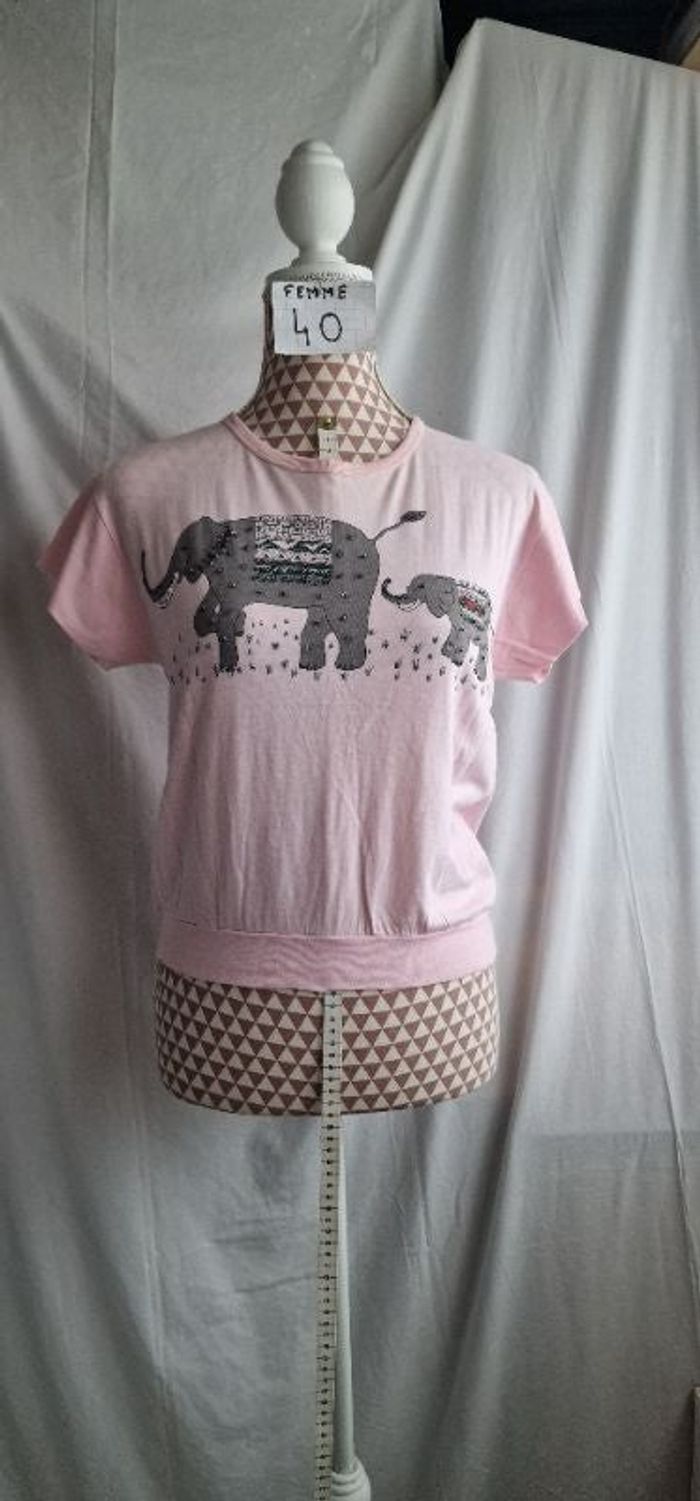 Tee-shirt, crop top,rose à motif Éléphant, en très très bon état, en coton, longueur 48cm, largeur d'épaule 43cm, largeur sous bras 47cm, marque Asia Market =5€