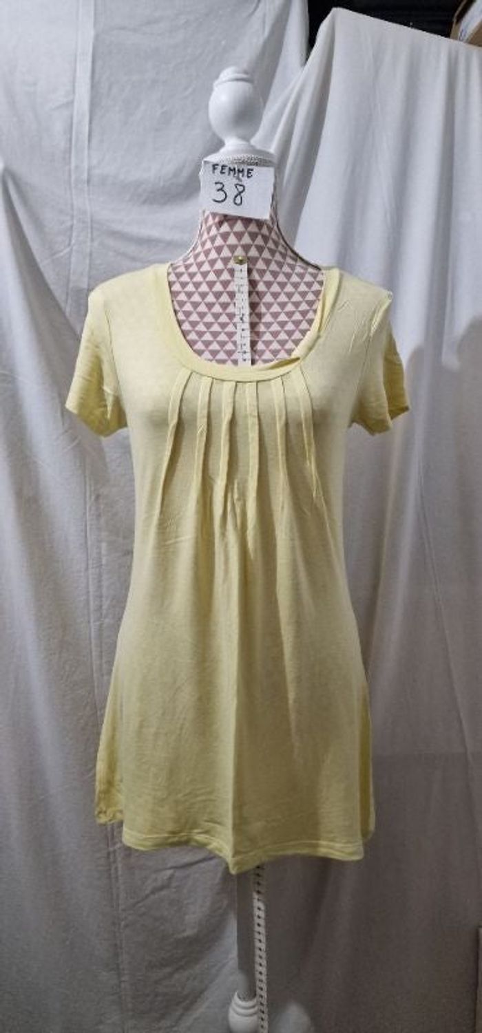 Robe mini ,jaune ,en très très bon état, en viscose &elasthanne, longueur 73cm, largeur d'épaule 36cm, largeur sous bras 44cm, marque Gémo =4€