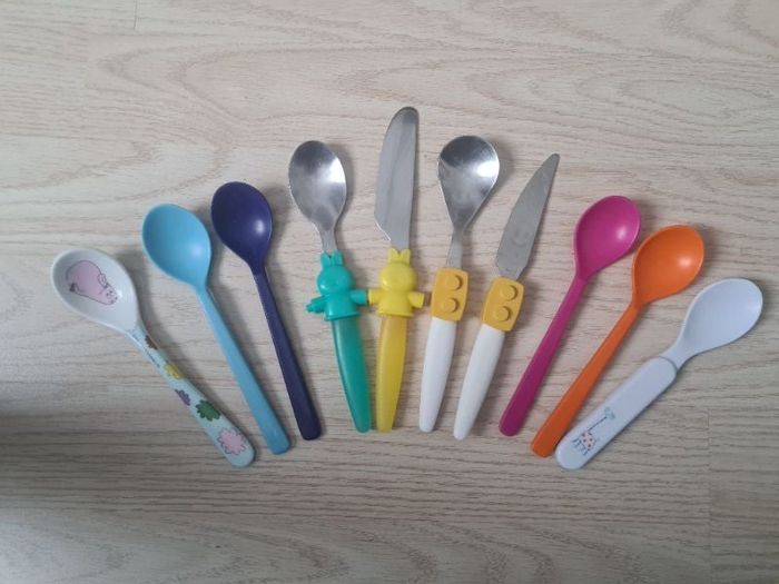 Lot 10 Couverts pour Bébé. 8 cuillères et 2 couteaux. En métal ou plastique. En bon état.