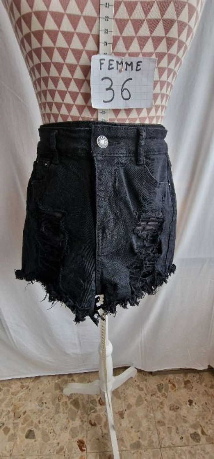 Short,noir, en jean, en coton & elasthanne, façon déchiré, neuf, longueur 31cm,longueur entrejambes 29cm, largeur 33cm, marque Asia Market= 7€
