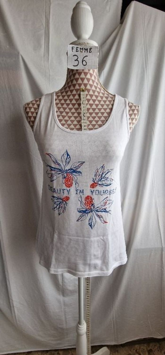 Débardeur, blanc à motif bleu&rouge,neuf, en coton, longueur 60cm, largeur d'épaule 29cm