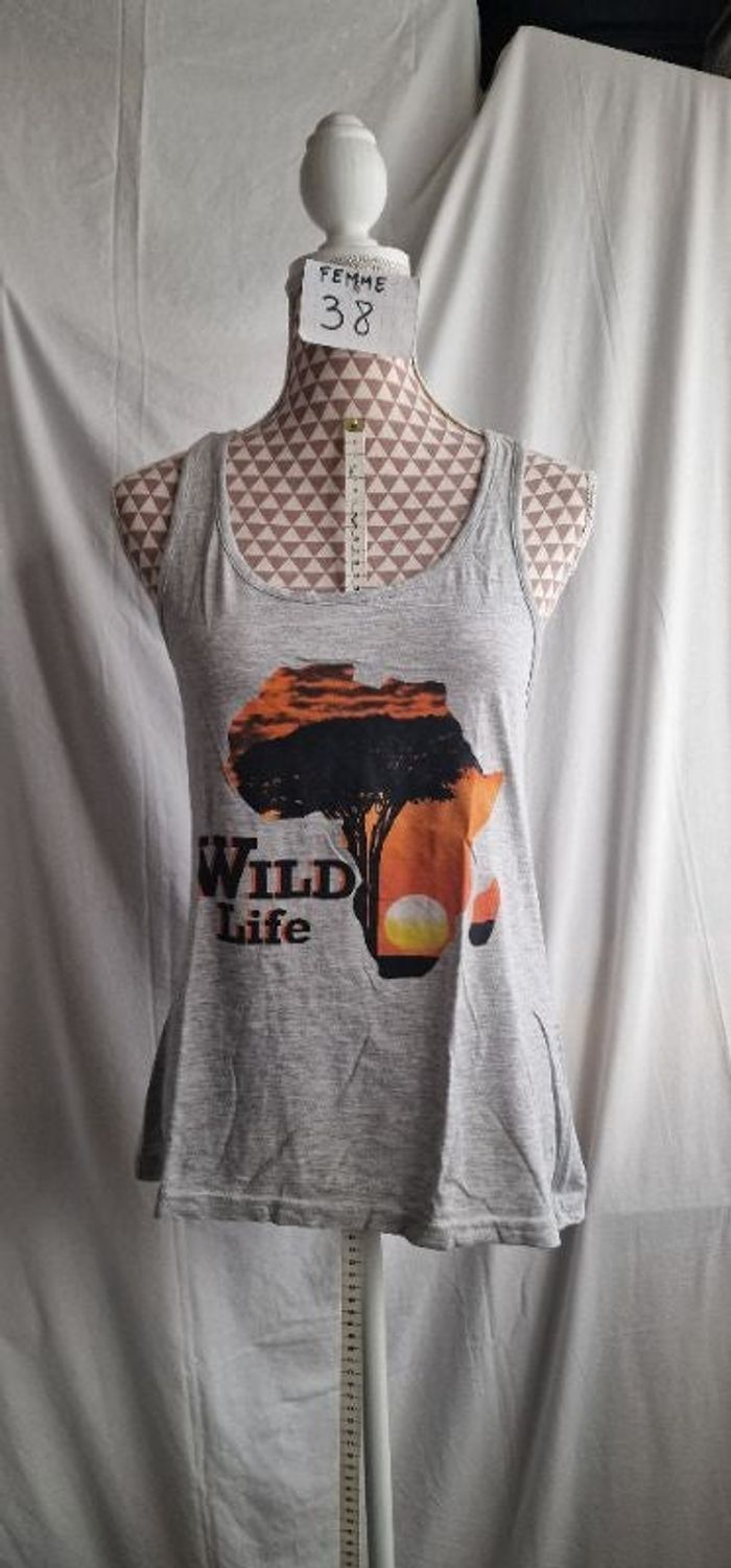 Débardeur, gris, à motif orange&noir, en très très bon état, en coton & elasthanne, longueur 59cm, largeur d'épaule 28cm, largeur sous bras 43cm, marque Tissaïa =4€