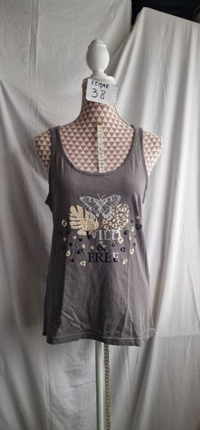 Débardeur, gris ,à motif argenté, en très très bon état, en coton, longueur 62cm, largeur d'épaule 29cm, largeur sous bras 44cm, marque Tissaïa =4€