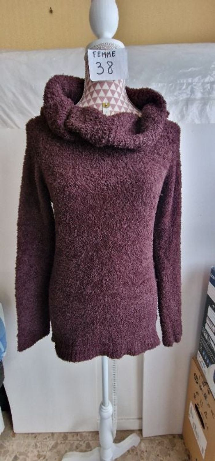 Pull ,chaud, prune, col roulé, en très bon état, en polyester &acrylique, longueur 65cm, largeur d'épaule 42cm, largeur sous bras 47cm, marque In Extenso =6€