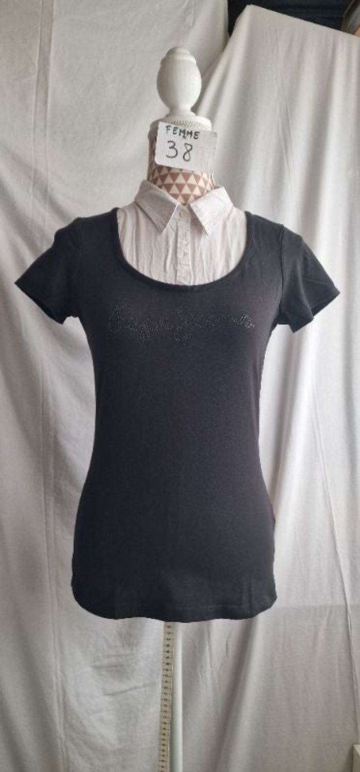 Tee-shirt, noir & blanc, en très très bon état, en coton & elasthanne, longueur 61cm, largeur d'épaule 33cm, largeur sous bras 44cm, marque Pépé Jeans =5€