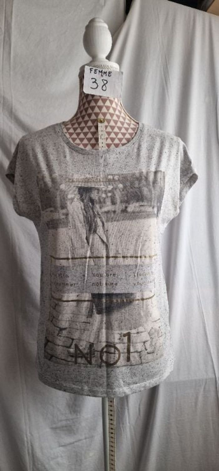 Tee-shirt, gris à motif doré, en très très bon état, en polyester & coton, longueur 61cm, largeur d'épaule 37cm, largeur sous bras 48cm,marque Kiabi =4€