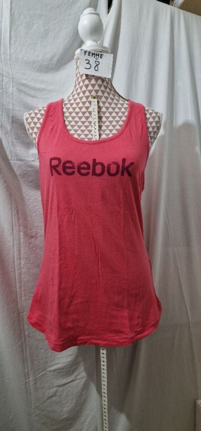 Débardeur, rose, en très très bon état, en coton, longueur 65cm, largeur d'épaule 26cm, largeur sous bras 42cm, marque Reebok=8€