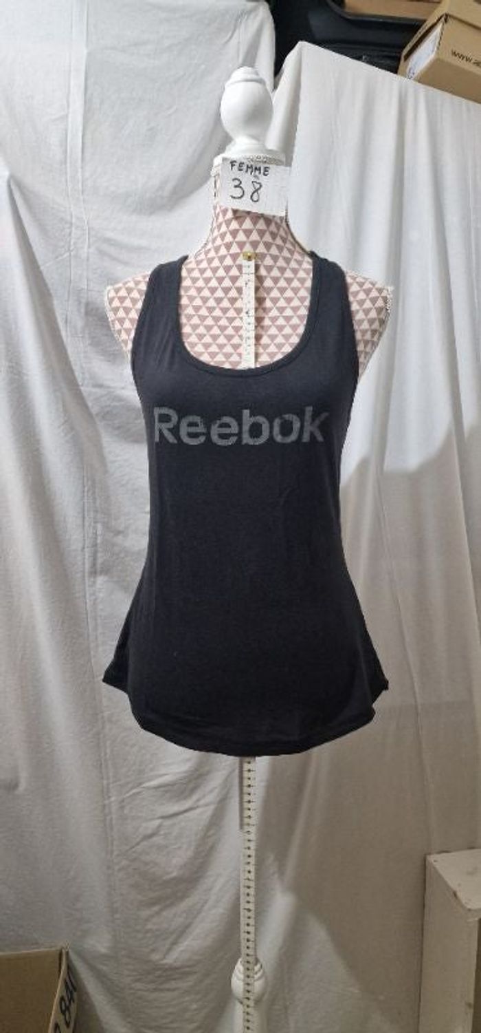 Débardeur, noir, en très très bon état, en coton, longueur 62cm, largeur d'épaule 28cm, largeur sous bras 43cm, marque Reebok=8€