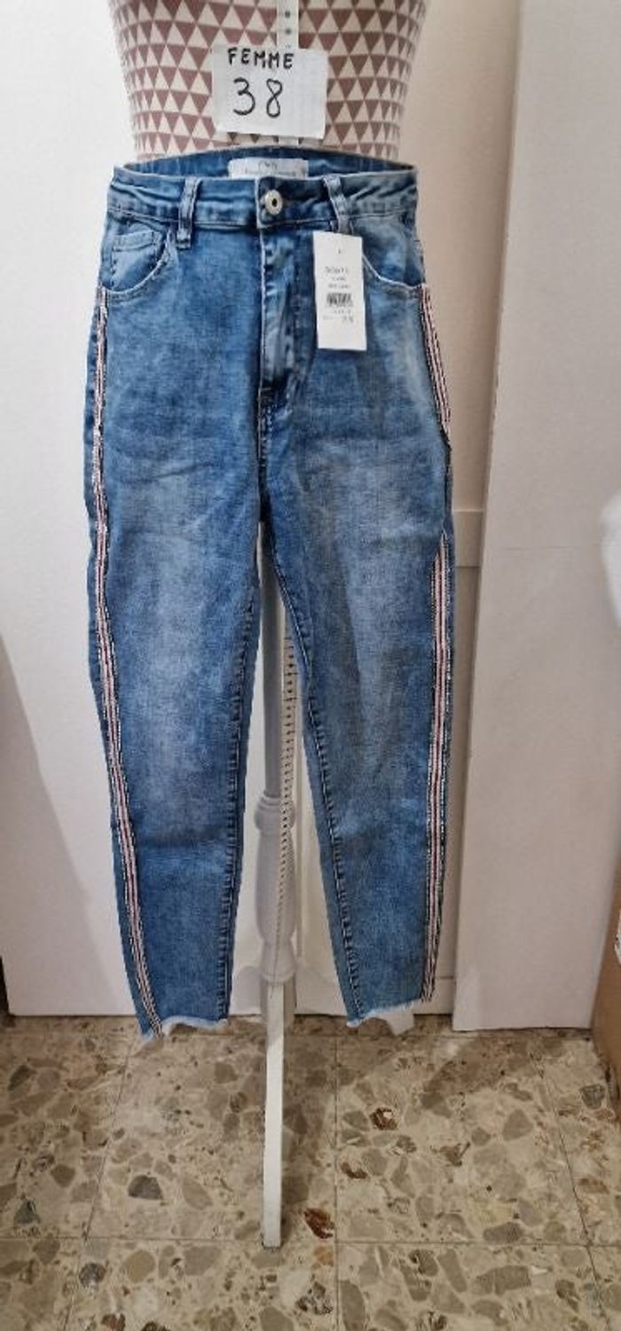 Jean, bleu, à rayures blanches & rouges & brillantes sur chaque côté, neuf avec étiquettes,en coton & polyester & elasthanne, longueur 93cm, largeur 33cm, taille haute ( 31cm),forme Slim /Skinny, marque Monday Premium =20€ au lieu de 29.90€