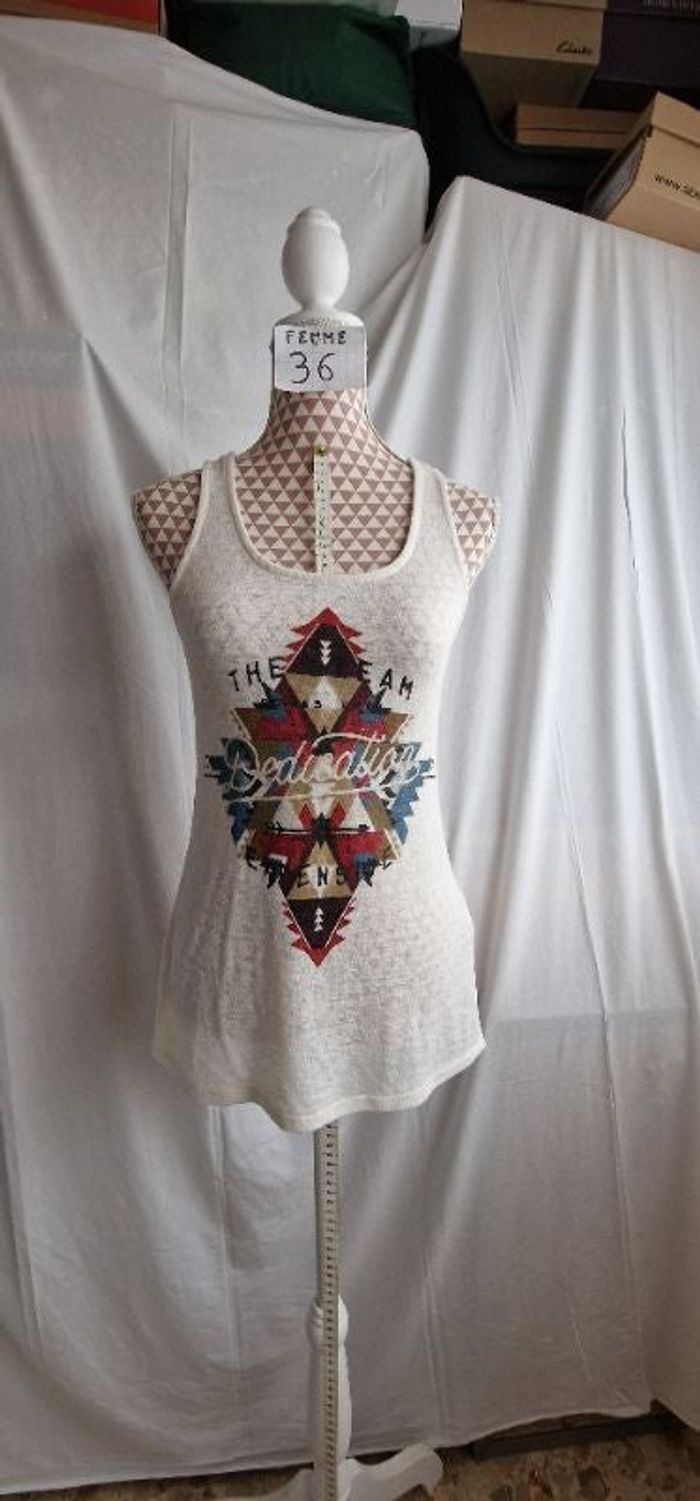 Débardeur, crème à motif rouge & bleu, en très très bon état, en polyester & viscose, longueur 65cm, largeur d'épaule 27cm, largeur sous bras 39cm,marque Pimkie =4€