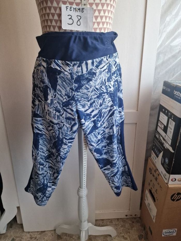 Pantacourt de sport, bleu & blanc, en très très bon état, en polyester & elasthanne, longueur 67cm, zip poche latéral droit, zip poche dos, cordon de serrage, taille standard, forme collante, marque Décathlon =6€