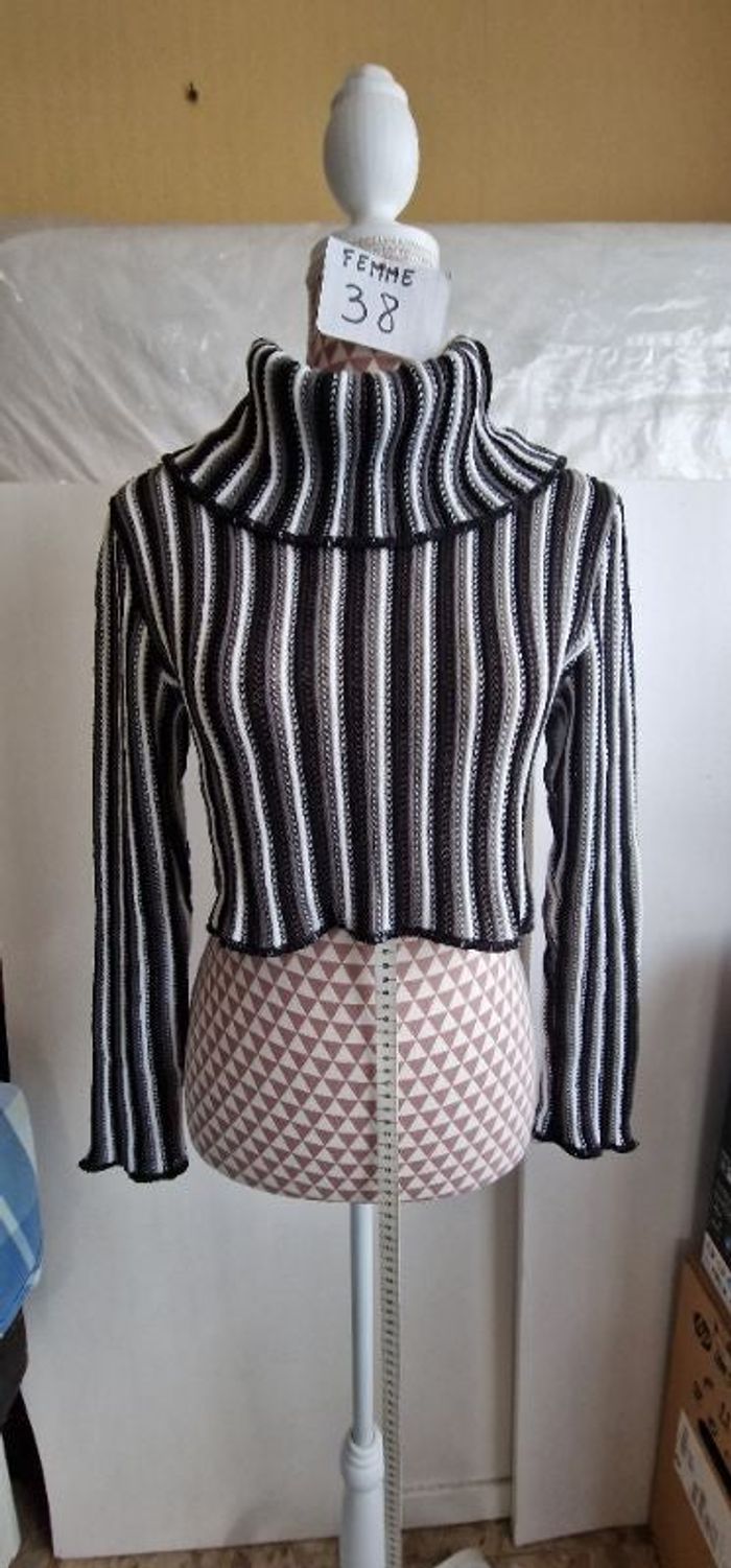 Pull, a rayures noir & blanche, crop top, en acrylique, très très bon état, longueur 36cm, largeur d'épaule 38cm, largeur sous bras 46cm, marque Cache Cache =6€