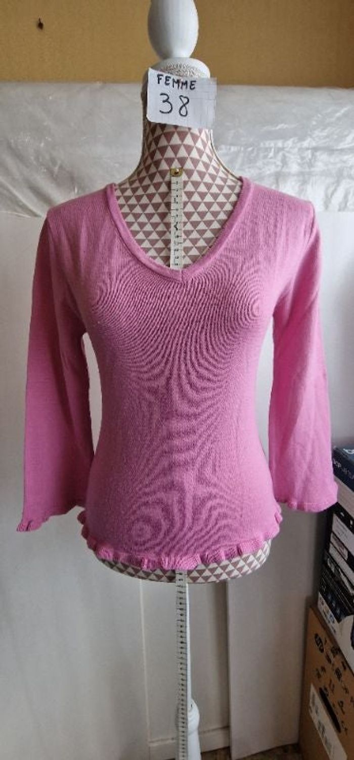 Pull, rose,en bon état ( légèrement bouloché),en acrylique, longueur 55cm, largeur d'épaule 36cm, largeur sous bras 41cm, marque Froggy =4€