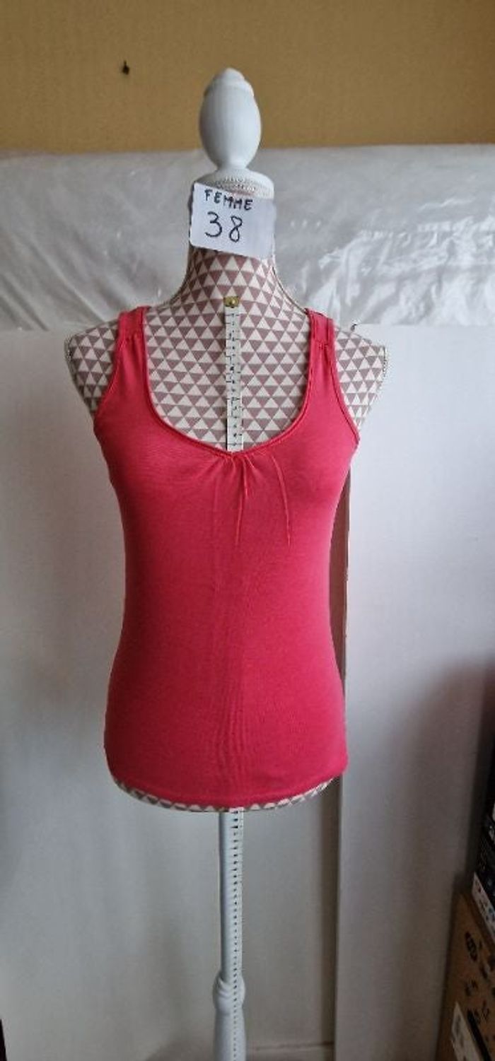 Débardeur, rose, en très très bon état, en coton & elasthanne, longueur 58cm, largeur d'épaule 29cm, largeur sous poitrine 37cm, marque Camaïeu =4€