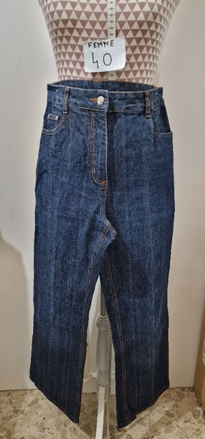 Jean, bleu, en très très bon état, en coton & elasthanne, taille haute, forme Flared, longueur 100cm, largeur 38cm, marque Blanche Porte =7€